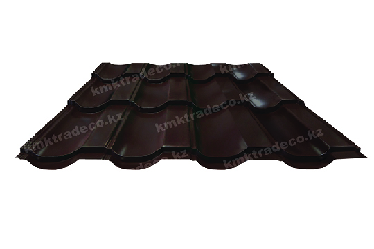 Металлическая кровля имеет максимальное сходство с натуральной черепицей. Листы изготовлены из тонколистовой стали толщиной 0.45 мм с МАТТ (матовым) покрытием премиум-класса – придаёт поверхности кровли необычный матовый «бархатистый» вид. Цвет – RAL 8017 Графитовый серый. Высота профиля – 25+/-1 мм.