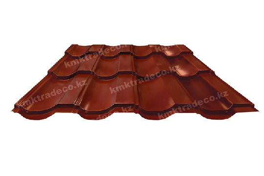 Металлическая кровля имеет максимальное сходство с натуральной черепицей. Листы изготовлены из тонколистовой стали толщиной 0.50 мм с МАТТ (матовым) покрытием премиум-класса – придаёт поверхности кровли необычный матовый «бархатистый» вид. Цвет – RAL 8004 Медно-коричневый. Высота профиля – 25+/-1 мм.