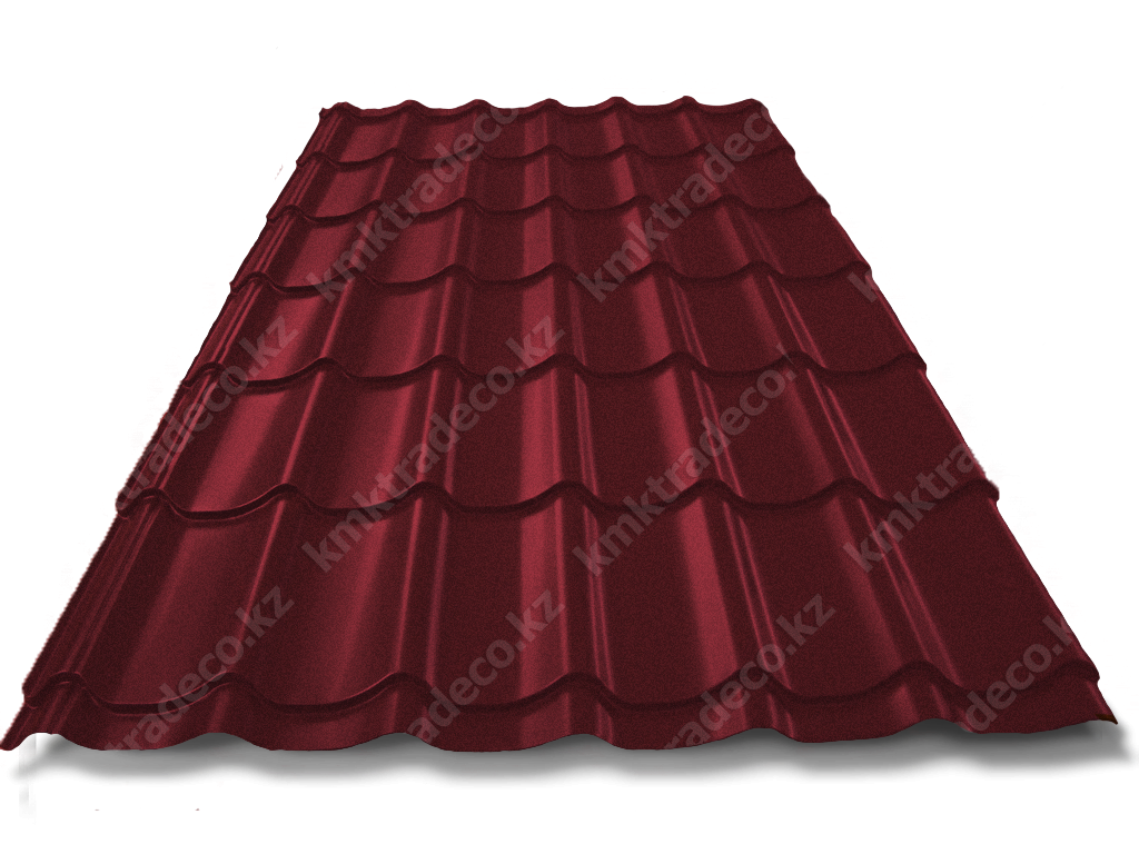 Металлическая кровля имеет максимальное сходство с натуральной черепицей. Листы изготовлены из тонколистовой стали толщиной 0.50 мм с МАТТ (матовым) покрытием премиум-класса - придаёт поверхности кровли необычный матовый «бархатистый» вид. Цвет - RAL 3004 Пурпурно-красный. Высота профиля - 25+/-1 мм.