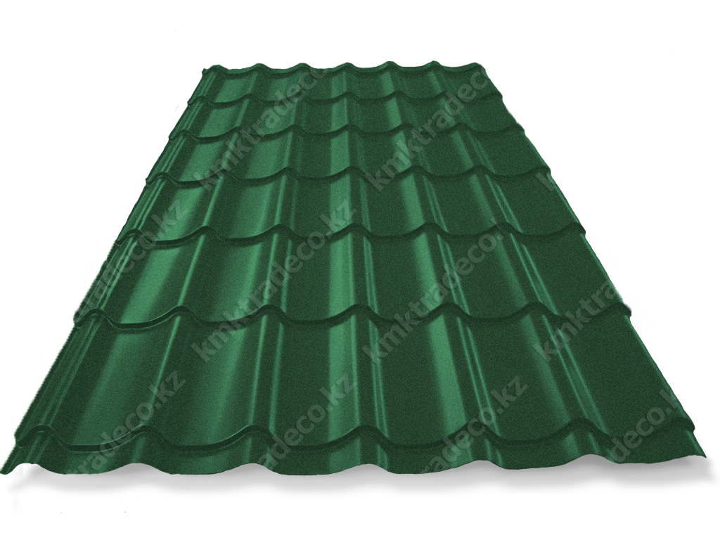 Металлическая кровля имеет максимальное сходство с натуральной черепицей. Листы изготовлены из тонколистовой стали толщиной 0.50 мм с МАТТ (матовым) покрытием премиум-класса – придаёт поверхности кровли необычный матовый «бархатистый» вид. Цвет – RAL 6005 Зеленый мох. Высота профиля – 25+/-1 мм.