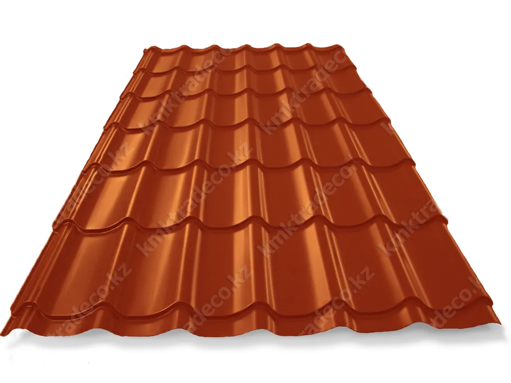 Металлочерепица Супермонтеррей – один из самых популярных видов данного кровельного материала. Металлическая кровля имеет максимальное сходство с натуральной черепицей. Листы изготовлены из тонколистовой стали толщиной 0.5 мм с полимерным защитным слоем. Цвет – RAL 8004 Медно-коричневый. Высота профиля – 25+/-1 мм.