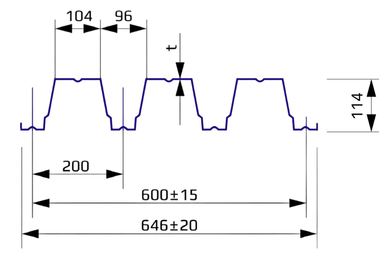 Профлист Н-114 является наиболее прочным и высоким профилем среди холоднокатаного листа в каталоге. Высота профиля составляет 114 мм, и он имеет множество рёбер жёсткости. Профнастил Н-114 выпускается с рабочей шириной листа 600 мм. Особенностью листов шириной 600 мм является наличие одной бороздки на вершине трапеции. Эти элементы и канавки, идущие вдоль гребня волны, придают листу дополнительную жёсткость. Благодаря этому профлист Н-114 подходит для строительства крупных зданий, таких как торговые центры, фабрики, спортивные комплексы и стадионы, а также для кровель в регионах с высокой снеговой нагрузкой и монтажа несъёмной опалубки. Этот материал также может использоваться для межэтажных перекрытий, каркасных сооружений и наружных стен.